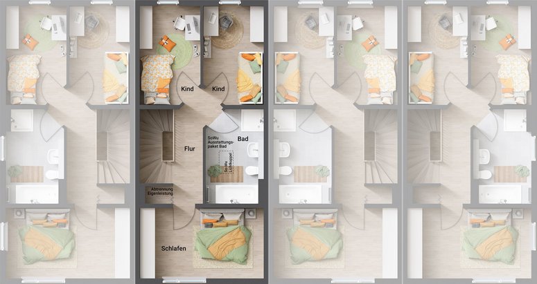 Dank dem flexiblen Grundriss kann das Reihenhaus Ihren Traum vom Eigenheim erfüllen! Im Obergeschoss ist der Rückzugsort für groß und klein. Angefangen bei zwei Kinderzimmern über das großzügige Schlafzimmer bis hin zur Spa-Oase. Werfen Sie einen Blick auf die Grundrisse und verwirklichen Sie Ihr massives Traumhaus.