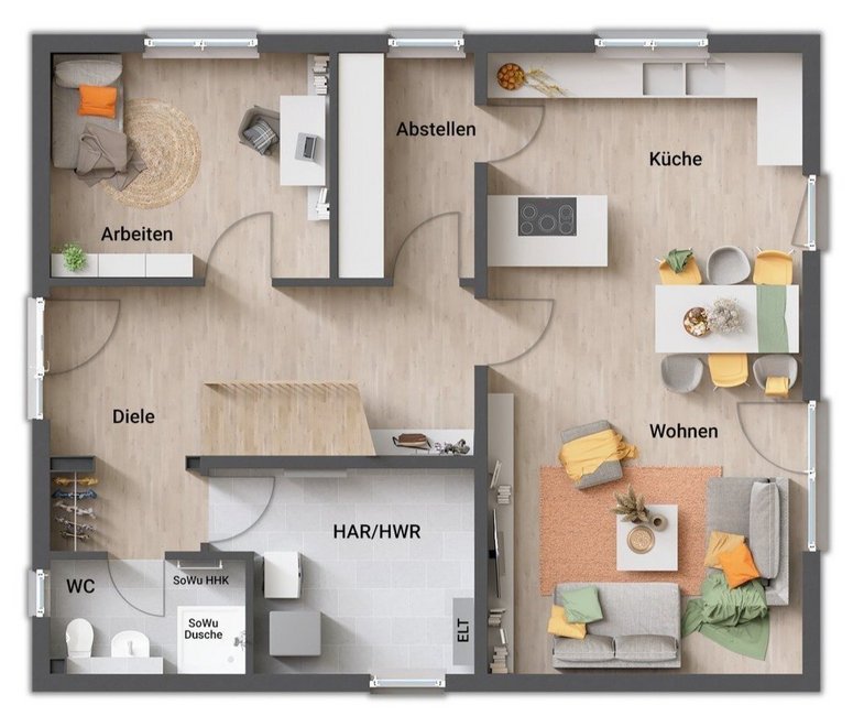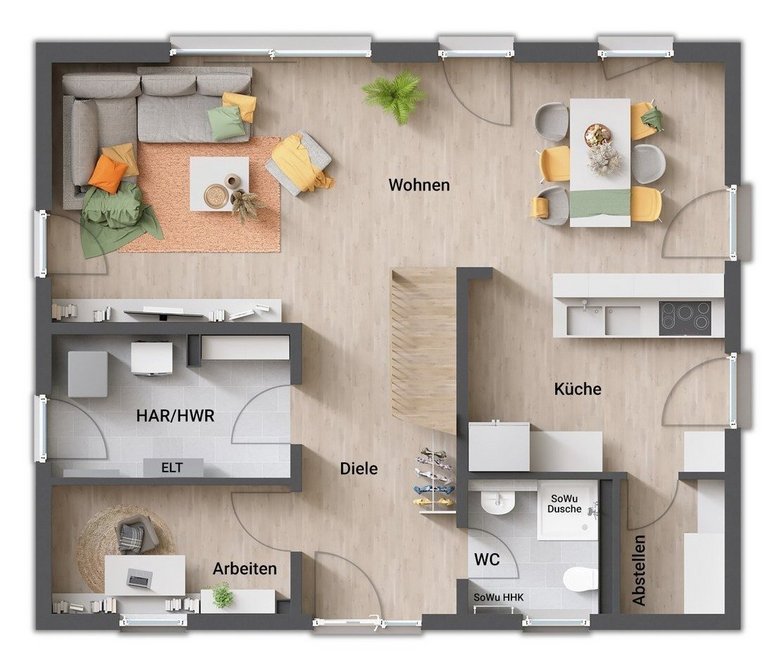 - aufgeräumtes/cleanes Erdgeschoss (Trennung des „technischen“ Bereichs (Hausanschlussraum, WC, Arbeit) vom „gesellschaftlichen“ Bereich (Wohnen, Kochen)