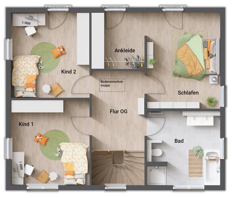 - Eltern- und Kinderbereich im Obergeschoss getrennt durch den Flur