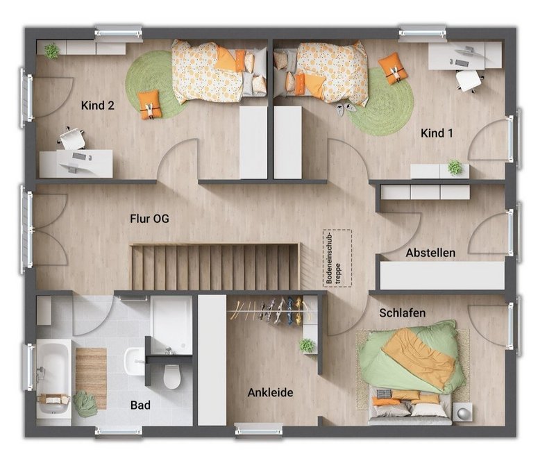Auch das Obergeschoss zeigt sich im gradlinigen Baustil des Hauses. Hier finden Sie drei Zimmer, die Sie nach Ihren Vorstellungen als Schlaf-, Kinder- oder Gästezimmer nutzen können. Große Fenster lassen auch hier viel Tageslicht hineinströmen. Die Ankleide im Schlafzimmer bietet viel Stauraum.