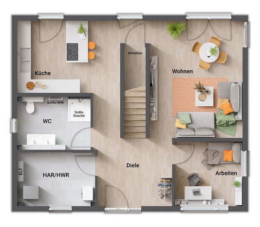 - gerade Treppe (zentral im Erdgeschoss, „teilt“ Koch- und Wohnbereich)